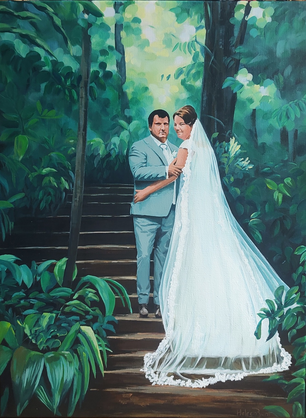 Dit mooie stel wilde graag wat anders dan gewoon een foto van hun trouwdag. Zij hebben mij gevraagd om een schilderij te maken van een prachtig moment op hun bruiloft. Het geheel is geschilderd met acryl op hoogwaardig linnen met een formaat van 60x80 cm