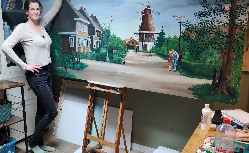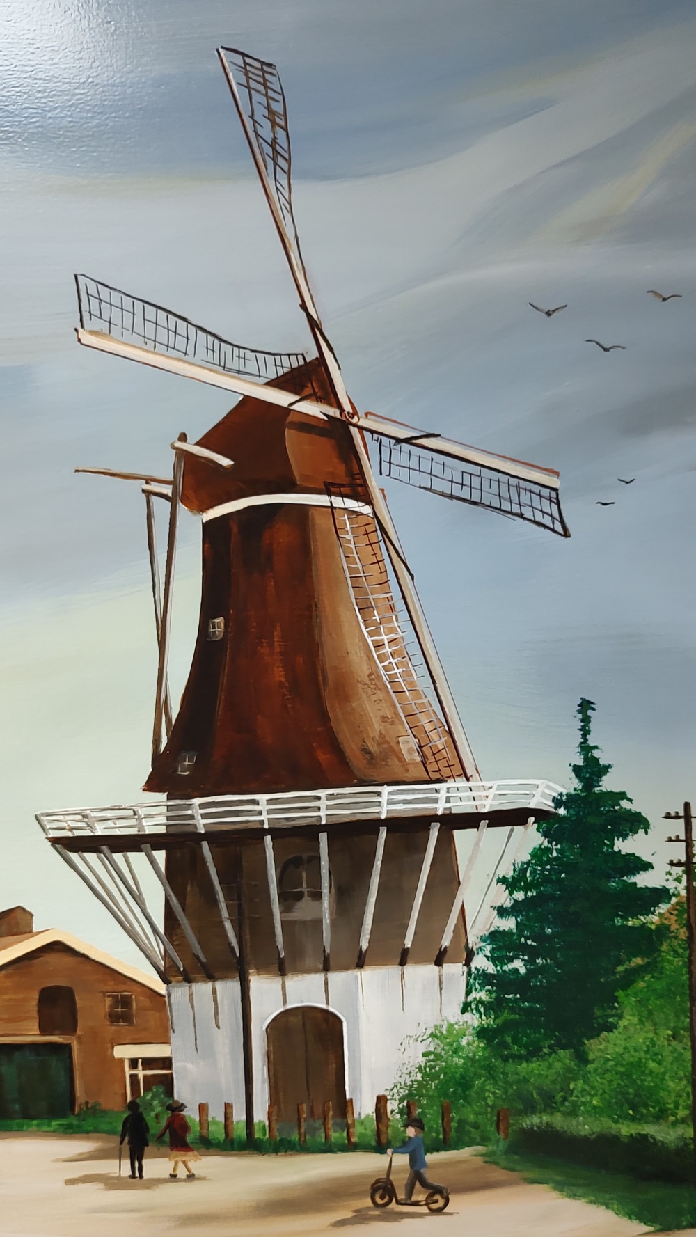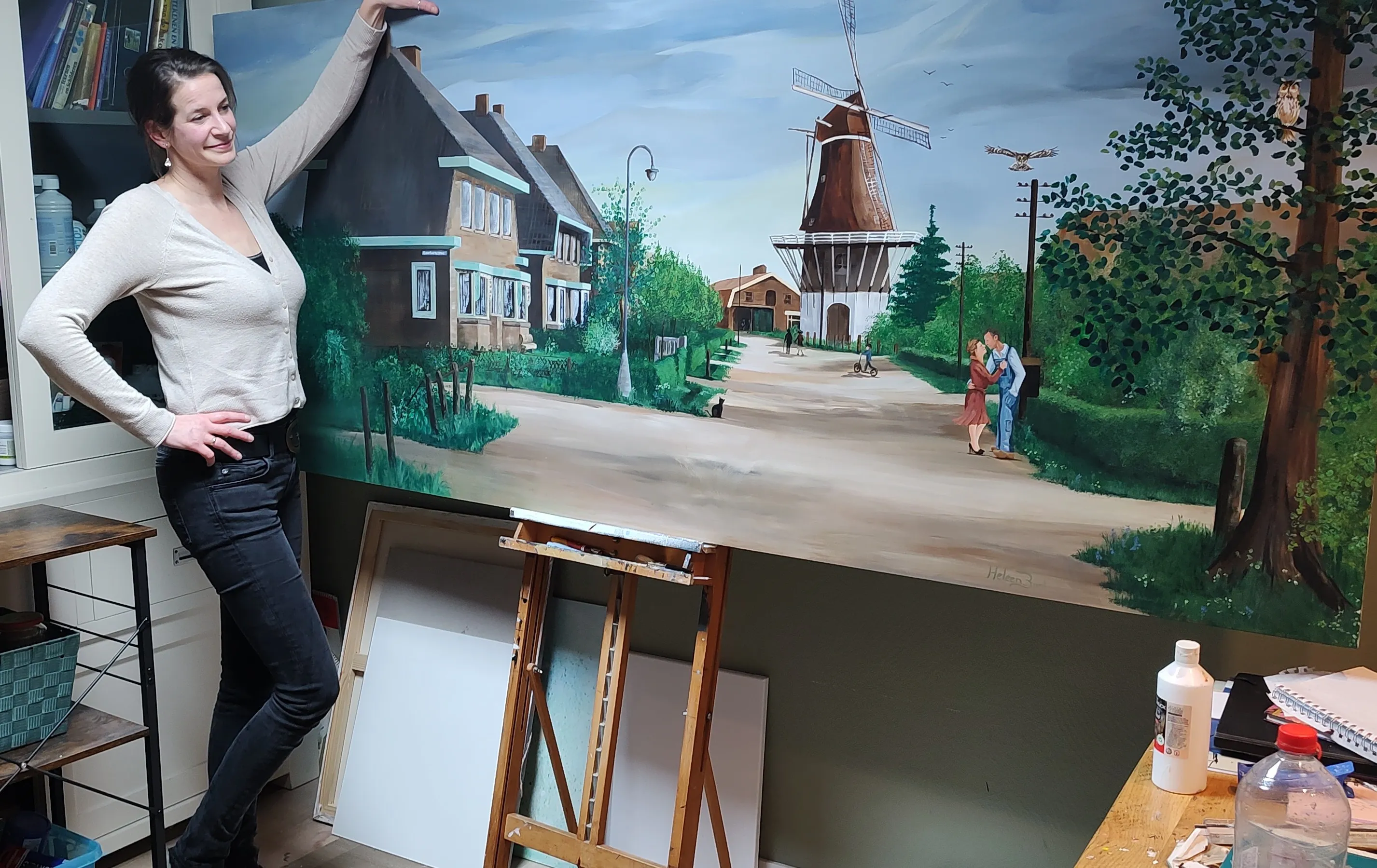 Voor een stroopwafelkraam is mij gevraagd om de "saaie witte binnenkant" op te vullen met een mooie ouderwetse schildering van Voorthuizen. Dit is in overleg gedaan op multiplex met een formaat van 110 x 240cm., en is na afronding van het schilderij in de kraam gemonteerd. Het is inmiddels te bewonderen op de zaterdagen als de stroopwafelkraam in Voorthuizen staat.