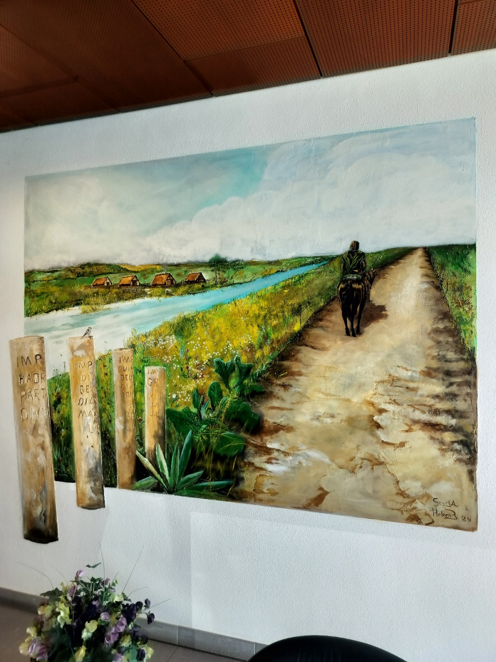 Voor een appartementencomplex in Den Haag ben ik gevraagd in samenwerking met Geurt Aangeenbrug van Aangeenbrug Restauratie en Decoratie BV om de entree hal te voorzien van een muurschildering in het thema van de gevonden mijlpalen daar vlak bij. We zijn in de historie van de Mijlpalen gedoken, we vonden Cananefaten, iets over keizer Decius, forum Hadriani en nog meer geschiedenis over de Romeinen en Romeinse wegaanduidingen. We hebben in overleg met het bestuur van het appartementencomplex besloten om een soort historisch landschap te maken met daarin de mijlpalen verwerkt. Hier onder het resultaat. Het formaat is 250cm x 180cm